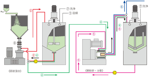 因材料研磨要求的不同,針對不同類型的材料、溶劑、粒度要求,一般采用通過式研磨、循環式研磨、間歇式研磨、A/B式研磨、串聯式研磨等
